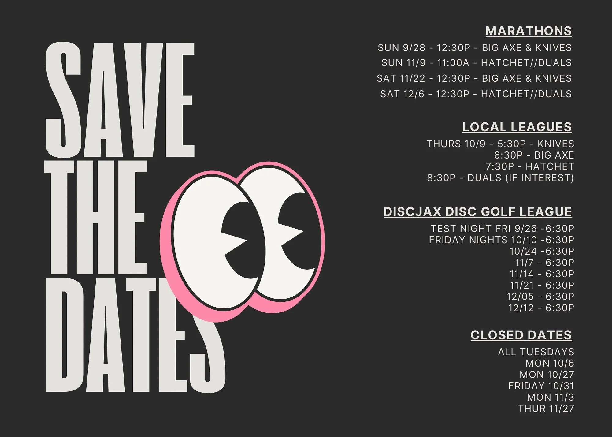 Perks — $5 Unlimited Practice from sign up until current league endS — $20 Unlimited Throwing friend (s) pass — 20% off all bookings (including rage room)